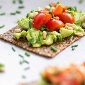 Snijd de cherrytomaatjes in tweeën en snijd de bieslook fijn. Maak de cracker helemaal af met de cherrytomaatjes, bieslook en pijnboompitten.